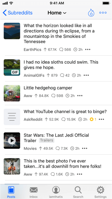 From the main screen (Posts), you’re able to browse the Reddit homepage in either an expanded or compact mode. The former is the default and is a better experience for viewing the imagery and videos accompanying the posts, but if you prefer a denser look, you can switch over to compact mode from the “more” button at the top-right of the screen.
