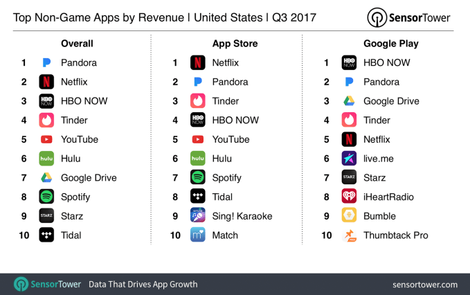 In the face of fierce competition from Spotify and Apple Music, Pandora has been growing its in-app subscription revenues, according to new data from Sensor Tower. The streaming music service earned the number one spot on the chart of top grossing apps in Q3 2017, excluding games. It’s the first time Pandora has held that position since the third quarter of 2015.