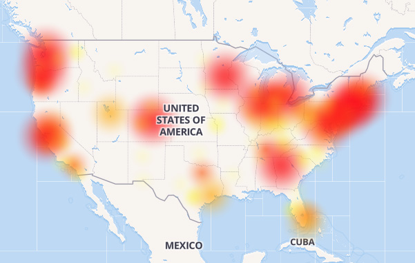 Down Detector’s user-generated outage map shows reports lighting up across the country