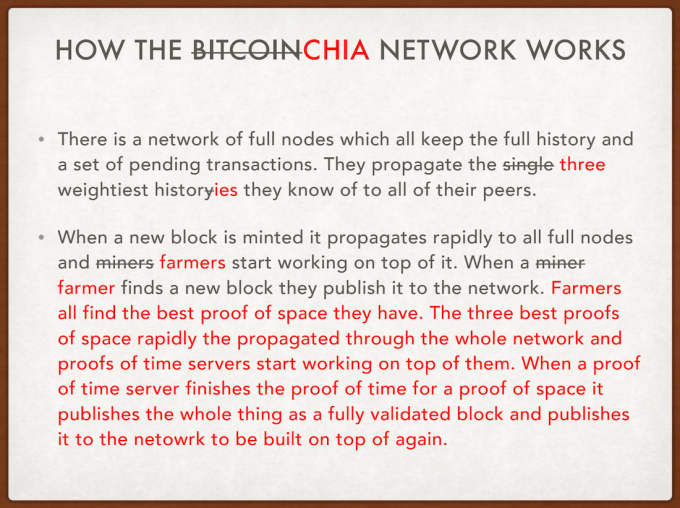 Cohen has teamed up with early bitcoin exchange Tradehill’s COO Ryan Singer and they’ve raised a seed round for Chia to ramp up hiring. Cohen wouldn’t say how much it had raised, laughing that, “I’m not sure how much we want to announce right now, but it was a very hot round.” The goal is do some early sales of Chia in Q2 2018, with a full launch of its cryptocurrency by the end of 2018, though Cohen says that’s a stretch goal.