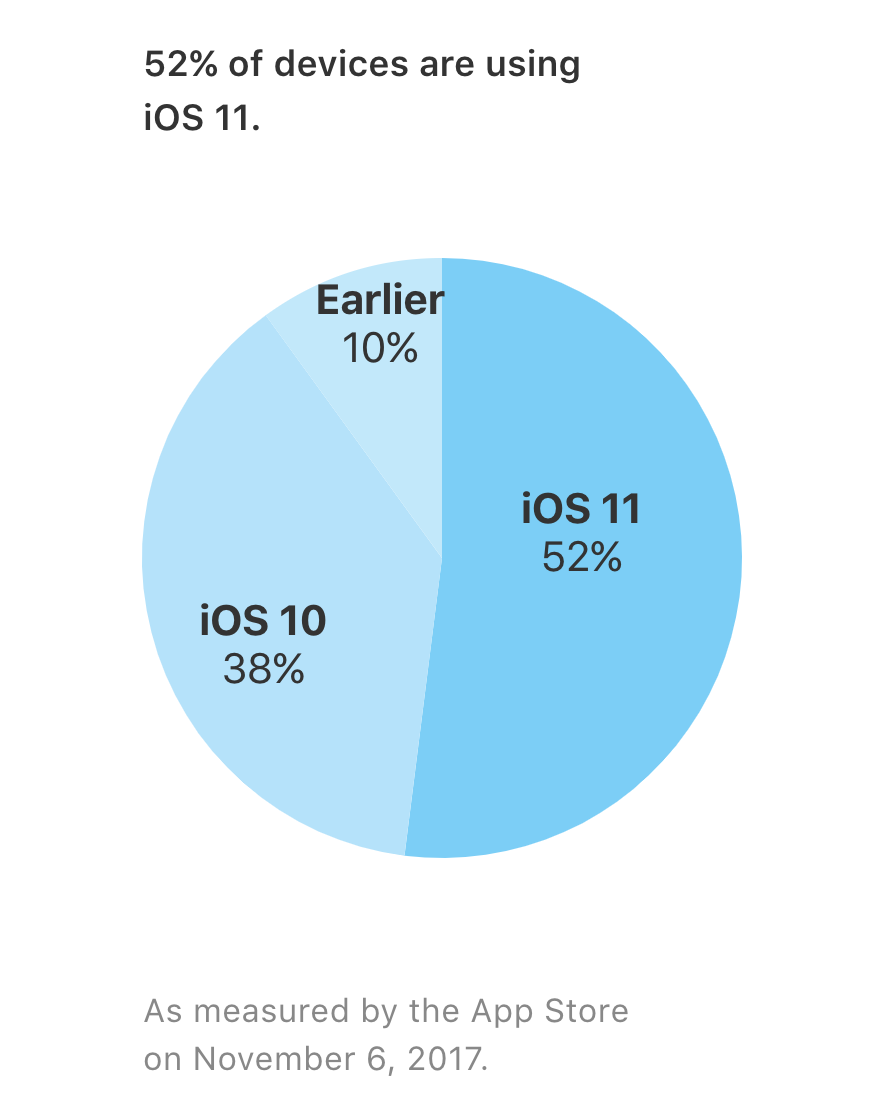 Apple has updated its App Store support page with new metrics. As of November 6, 2017, iOS 11 is now installed on 52 percent of iPhones and iPads currently in use. 38 percent of devices still run iOS 10, and only 10 percent of people are using an earlier version of iOS.