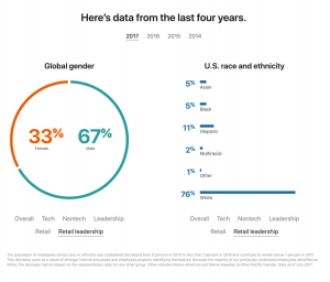 Let’s get into the numbers, which are as of July 2017. Apple is still 32 percent female worldwide. In the U.S., Apple is 54 percent white (down two percentage points from last year), 13 percent Hispanic (up one percentage point), nine percent black (no change), 21 percent Asian (up two percentage points), three percent multiracial (up one percentage point) and one percent other (no change).