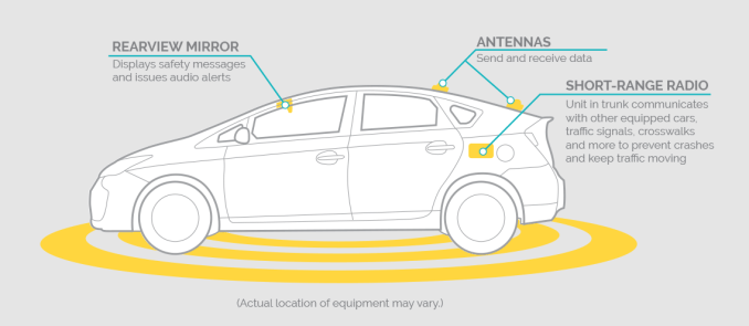 Cars also will have antennas for sending and receiving data, a speaker for audio alerts and a short-range radio for communicating with other cars, lights and crosswalks.