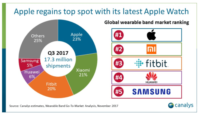 As for the others: Fitbit took third in Q3 2017 for 20 percent, while phone makers Huawei (six percent) and Samsung (five percent) were some way behind in rounding out the top five. In proof of considerable fragmentation within the industry, ‘other brands’ accounted for a dominant 25 percent, according to Canalys’ figures.