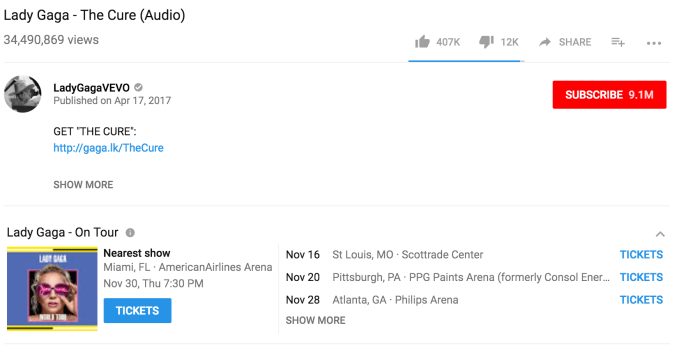 The new experience is available on an artist’s official music video on YouTube, meaning VEVO pages and artist channels. The event listings appear on YouTube desktop, and web and mobile app experiences on video watch pages.