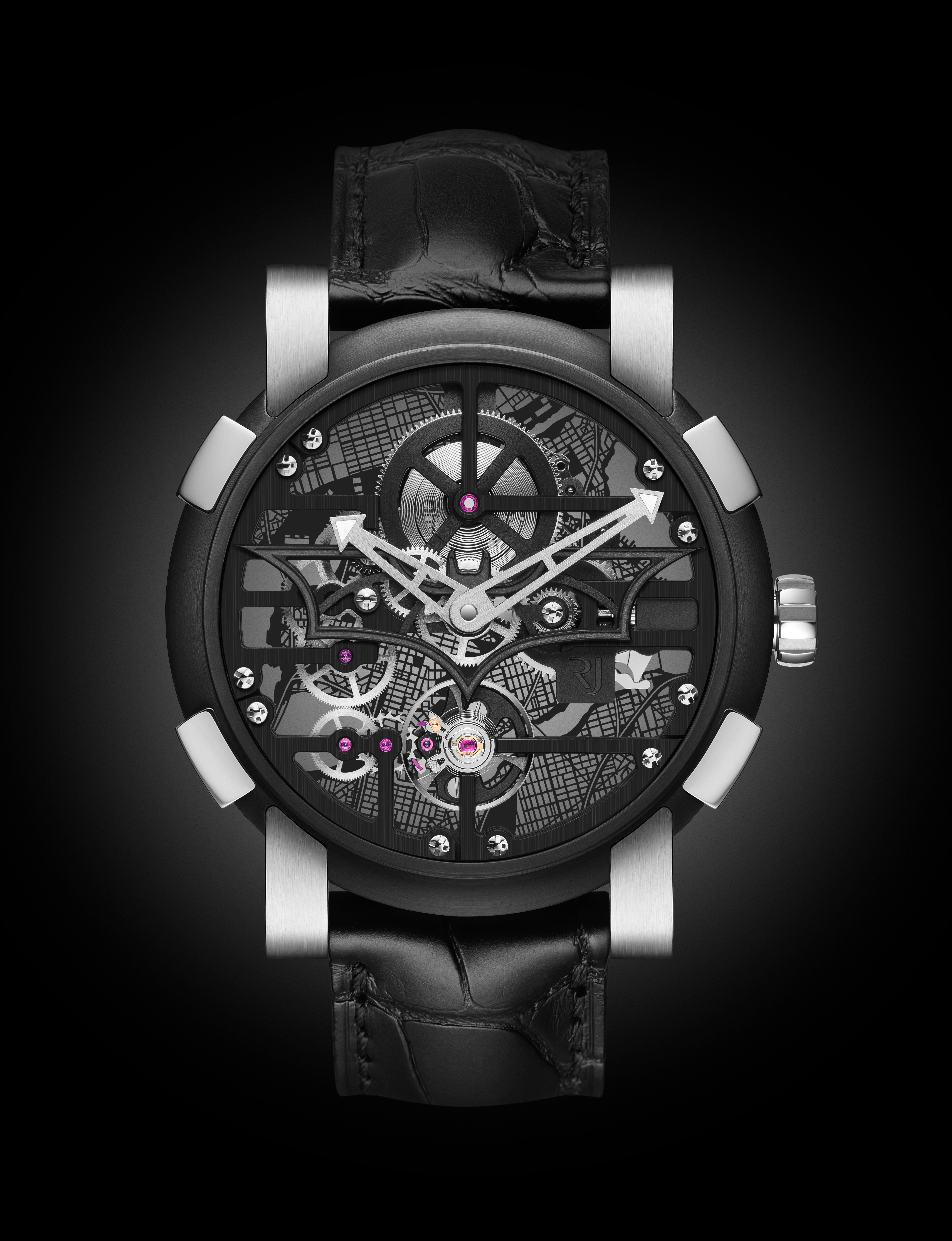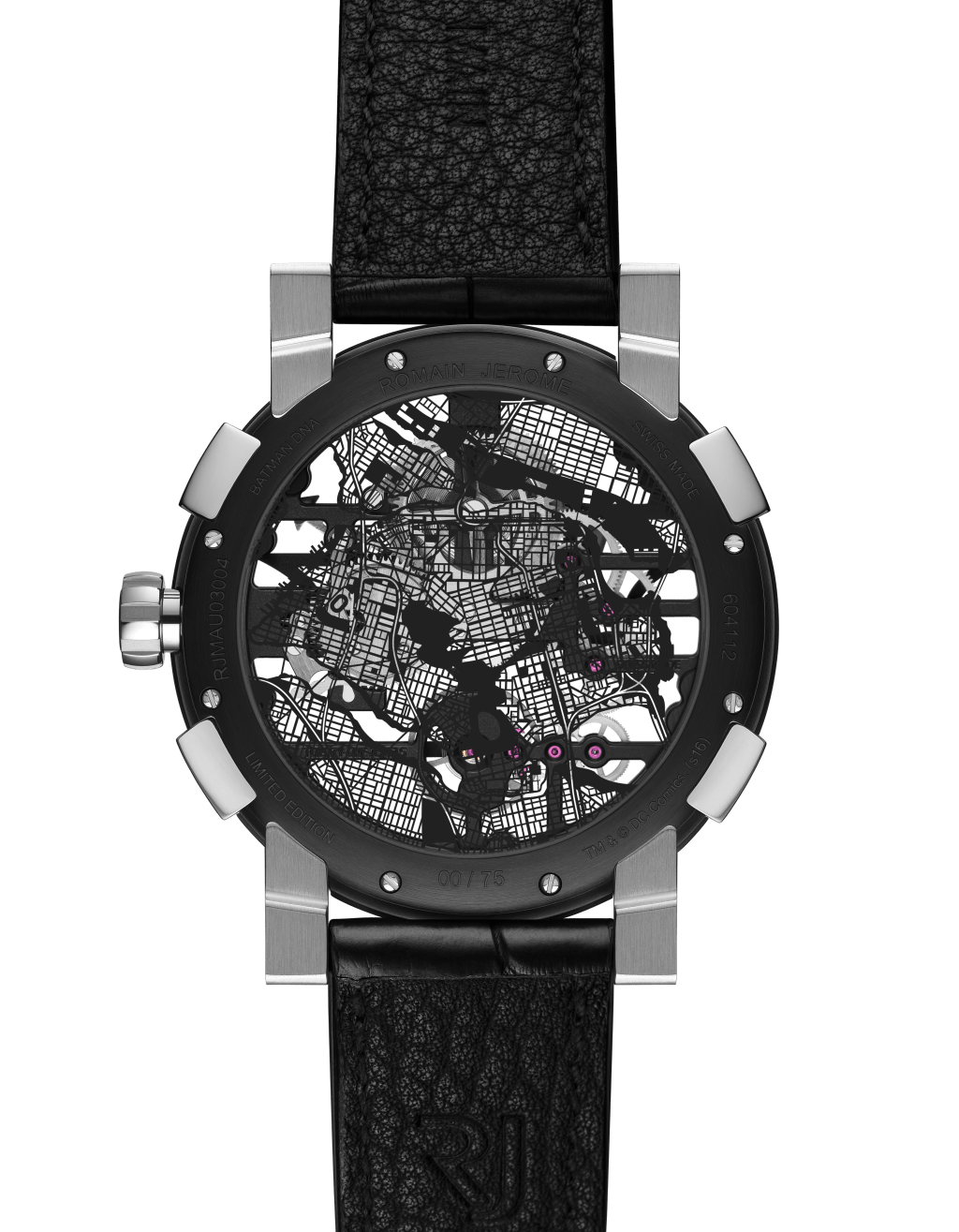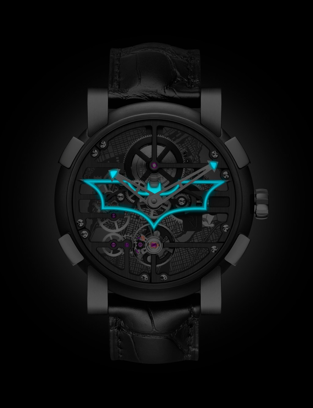 Watchmaker Romain-Jerome has announced a new Batman-themed watch that looks like something Bruce Wayne would wear to the club. The watch, which is based on R-J’s Skylab design, features a meticulous reproduction of a map of Gotham City cut into the rear sapphire glass and a glowing Bat Signal that lights up in the dark and/or in times of danger.