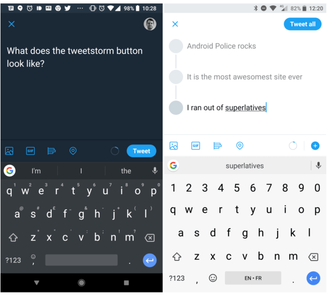 When asked, Twitter told TechCrunch that the tweetstorm feature has been in testing in both the alpha and beta programs on iOS and Android. The version shared by Android Police has been in testing for weeks, the company said.