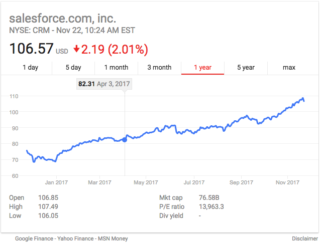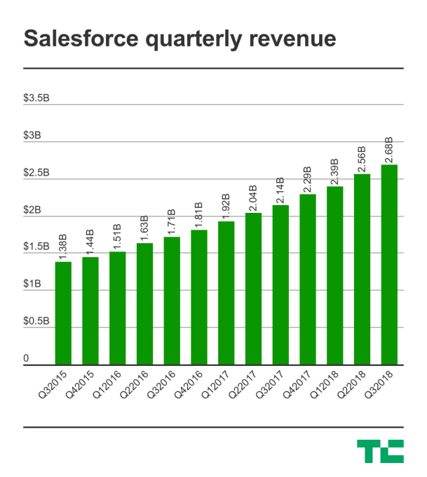 Salesforce is the anti-IBM. While Big Blue has had 22 straight quarters of declining revenue, Salesforce has been on a steady increase over the last several years. The company’s quarterly revenue going back three years to Q32015 has almost doubled from $1.38B to this quarter’s $2.68B.