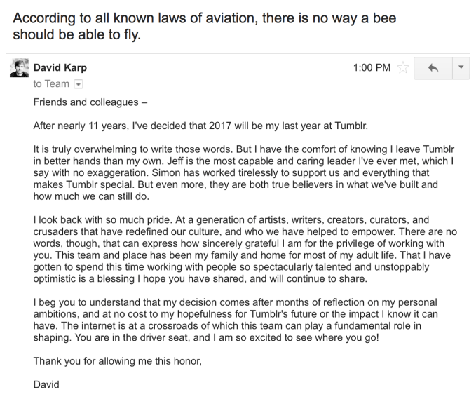 “David Karp will depart Oath by the end of the year,” the spokesperson said in an emailed statement. “David founded Tumblr ten years ago as a space for the world’s creators, and we thank him for his commitment and passion driving the growth of the platform to almost 380 million blogs and over 155 billion posts. Going forward, Jeff D’Onofrio, President and COO of Tumblr, will continue to lead the team.”