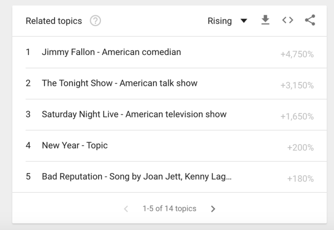 This gives you more angles into a search trend. To continue the Taylor Swift example, Google shows how a recent The Tonight Show appearance by the singer may lead to spikes in people searching for her performance on the show on YouTube, or images from that show on Google Images. These are shown as related topics and search interest is indicated with a percentage increase next to each climbing item.