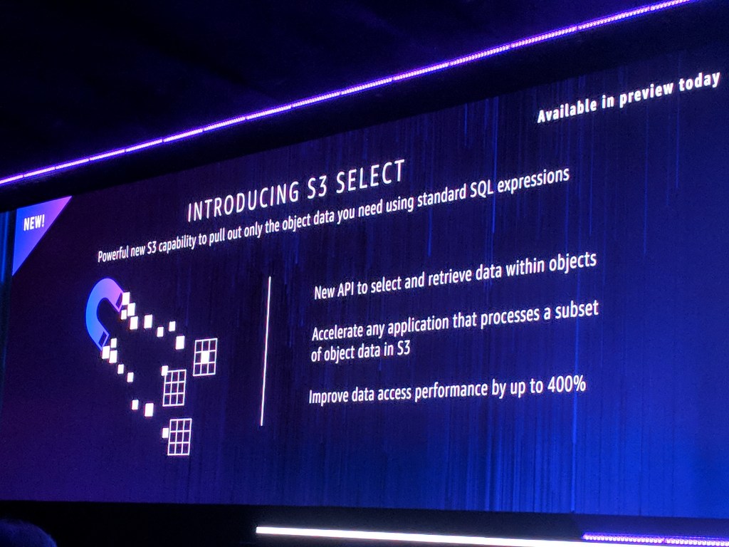 Jassy noted that on S3, this new service, dubbed S3 Select (and Glacier Select on the cold storage side), can improve data access performance by up to 400% because you don’t have to pull the complete object out of storage and then run your queries after that.