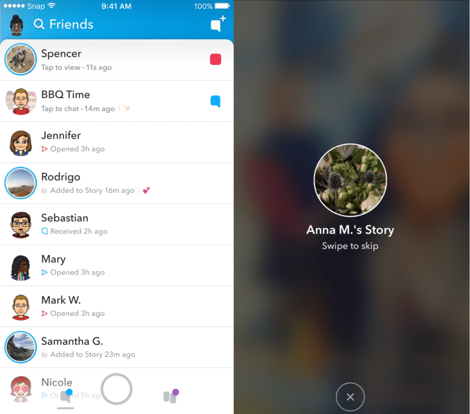 Snap is mixing Stories and private messages in a single Friends tab. First you’ll see new Snaps and text chats at the top, then Stories from your closest friends you watch and chat with the most, followed by the Stories from the rest of your acquaintances.