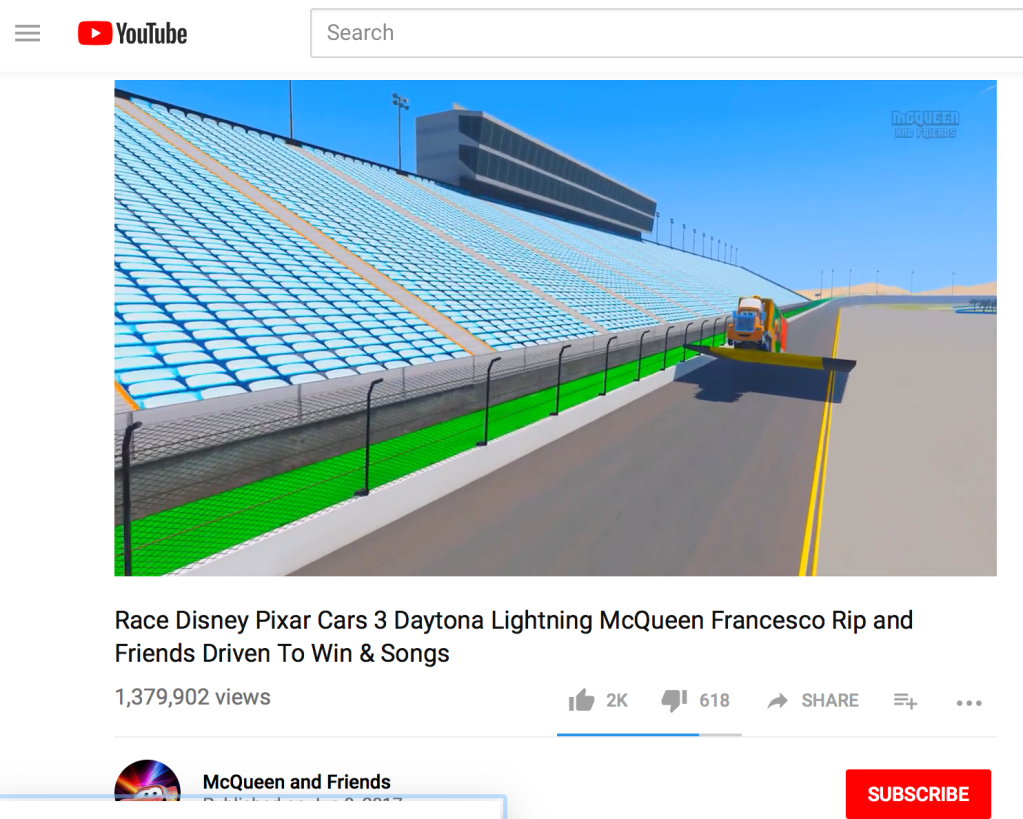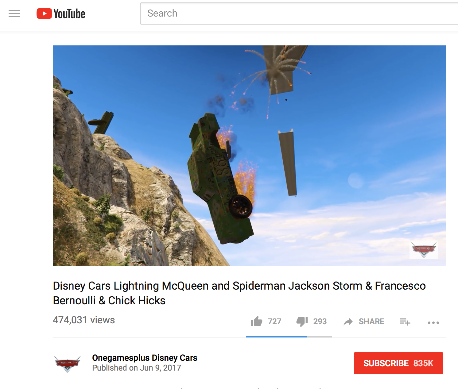 It is trivial to snake through the YouTube rabbit hole and find content that is violent, weird, and insanely popular. Start here, with a search for Cars.