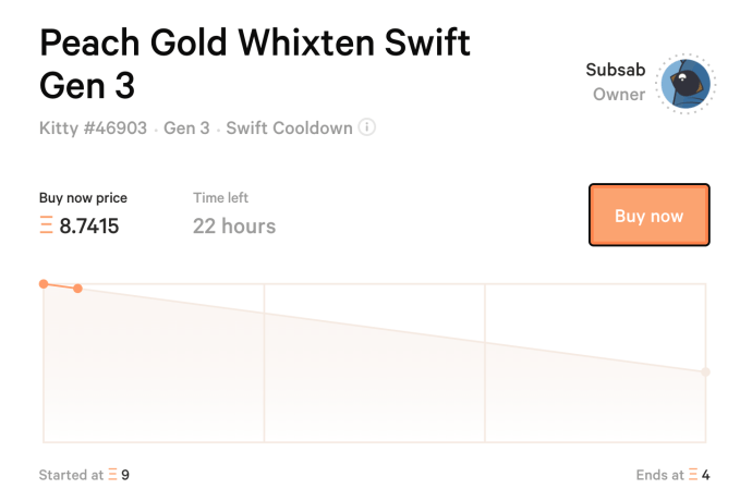 And anyone can sell their kittens via an auction, where they pick a starting price and an ending price and the price declines over time until someone buys it. So for example I could put a kitten up for sale for a one day auction for 1 ETH starting price and 0 ETH ending price, and if someone buys it 12 hours after the auctions starts they’d be paying me .5 ETH.