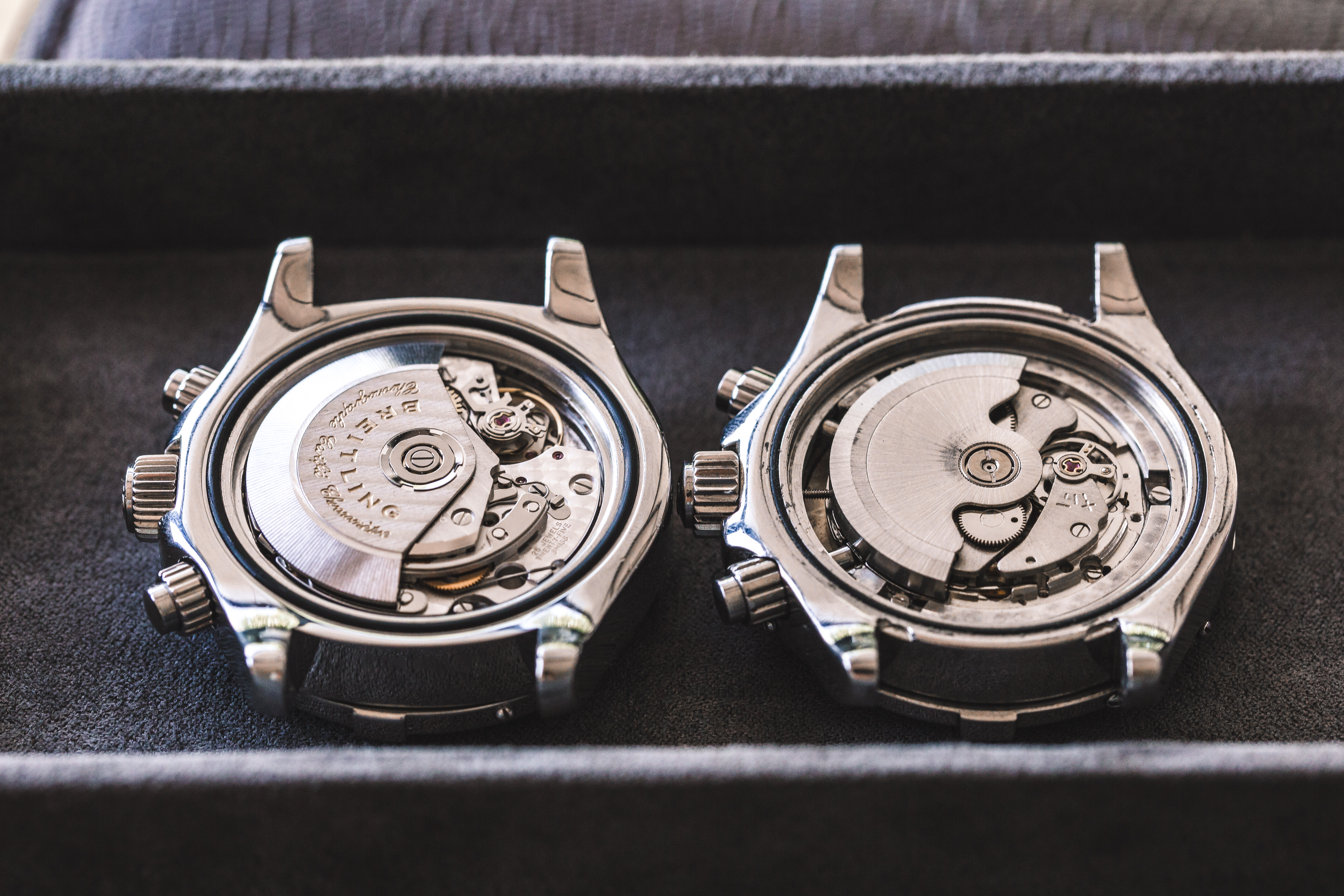 The trouble continues inside these pieces. In the photo above, the piece on the right is the fake. Compare it to the more austere but real movement on the left. The fake movement, a copy of the Unitas 6497, has been engraved with repeating logos and “beautified” with a few unique additions to an otherwise generic movement.