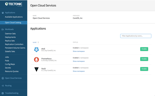 CoreOS is aiming to keep the whole process as open and portable as possible, so that customers can choose where and how they want to deploy their applications. What’s more, the Open Cloud Catalog is built right into the Tectonic console, making it simple to enable the external services (or disable them as you choose).