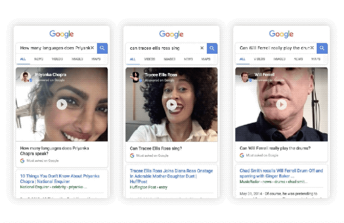 Google is testing a new feature that will allow celebrities and other notable figures to answer users’ search queries directly in the form of “selfie” videos posted in the Google Search results. The company says this program is initially being piloted on mobile with a handful of people for now, including Priyanka Chopra, Will Ferrell, Tracee Ellis Ross, Gina Rodriguez, Kenan Thompson, Allison Williams, Nick Jonas, Mark Wahlberg, James Franco, Seth MacFarlane, Jonathan Yeo and Dominique Ansel.