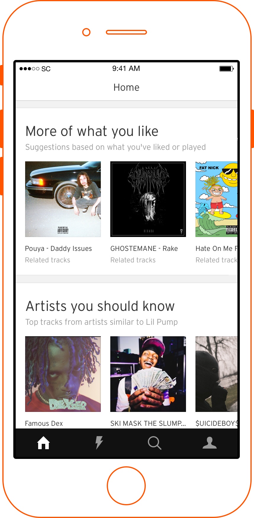 Listeners will now be greeted by featured playlists including Hip Hop Supreme and DJ mixset-focused In The Mix, the Spotify Discover Weekly-esque personalized tracklist The Upload, and algorithmically generated More Of What You Like and Artists You Should Know. There’s also New & Hot charts and Top 50 charts playlists, Fresh Pressed for new album releases, and editorially selected collections like SoundCloud Next Wave and Playback.
