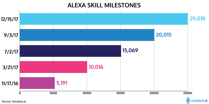 To be clear, Amazon has publicly stated during its third quarter earnings that the number of Alexa skills on its platform is over 25,000, but that figure includes skills available in international markets, like the U.K. and Germany. The U.S., the largest skill market, hadn’t yet reached 25,000 on its own at that time.