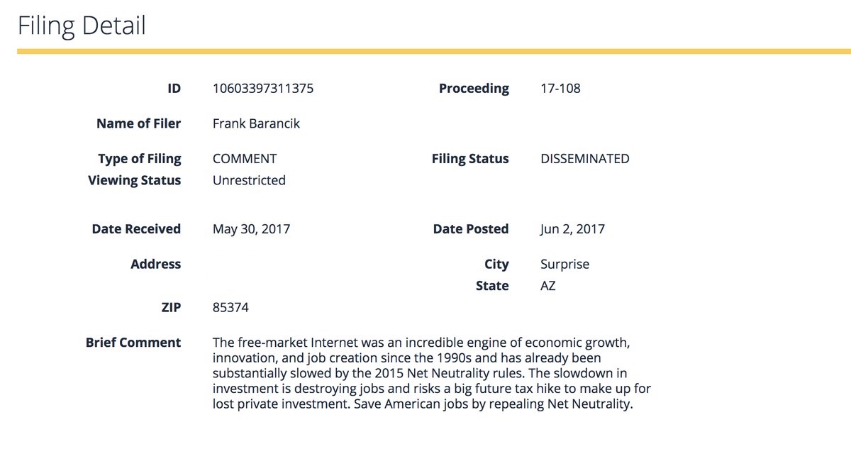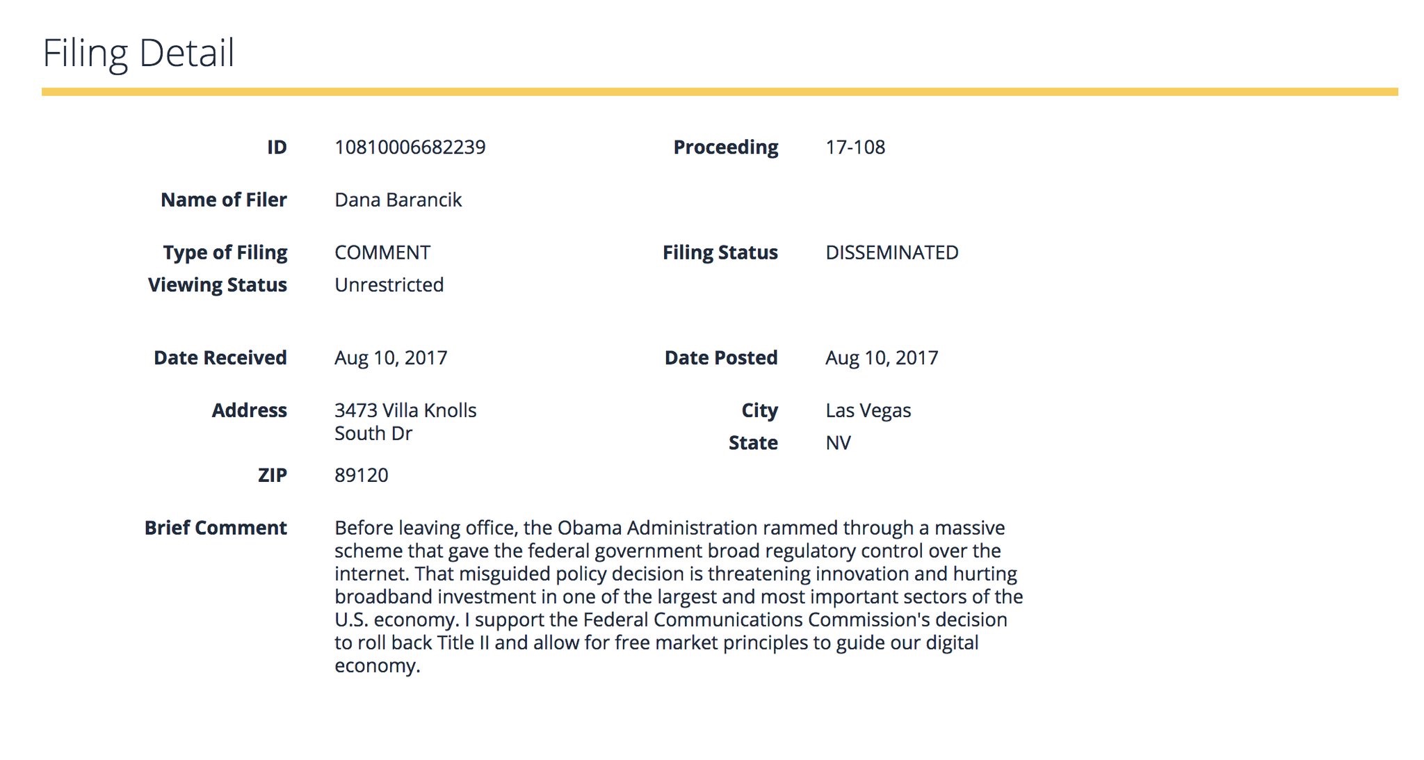“Before leaving office, the Obama Administration rammed through a massive scheme that gave the federal government broad regulatory control over the internet,” wrote the individual who used Mrs. Brancik’s name and address. “That misguided policy decision is threatening innovation and hurting broadband investment in one of the largest and most important sectors of the U.S. economy. I support the Federal Communications Commission’s decision to roll back Title II and allow for free market principles to guide our digital economy.”
