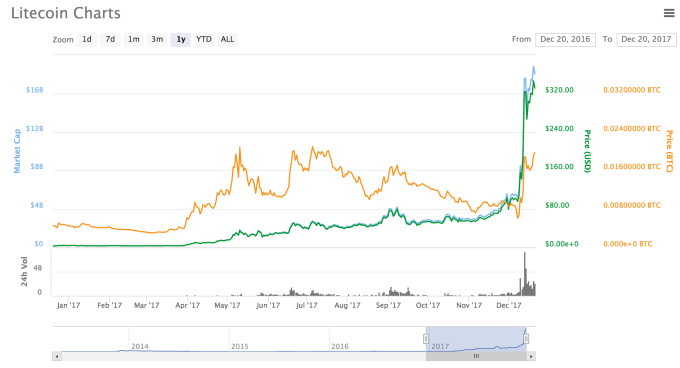 Trading volumes of the coin have also reached unprecedented levels at the tail end of 2017, as indicated in the bottom graph in the chart below. The last 24 hours saw over $2 billion in LTC traded, according to Coinmarketcap.com.