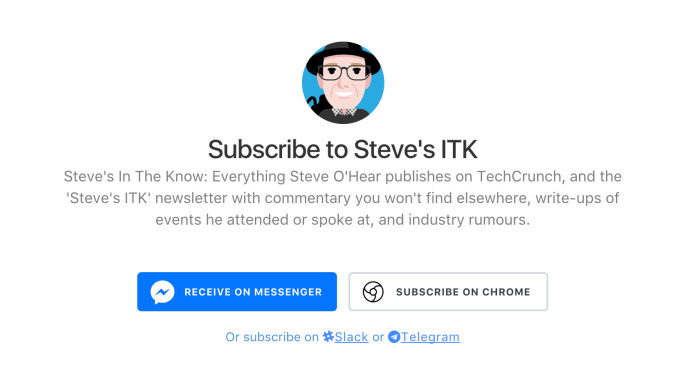 After doing so, you point Revoice to your content sources, such as your email newsletter, and the service takes care of the rest, automatically pushing new content to Messenger. You’re given a ‘subscribe to Messenger’ widget to post to your blog and your own ‘subscribe to Messenger’ landing page (you can view mine here). Revoice also has similar support for Chrome, Slack and Telegram, too.