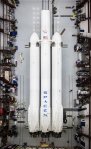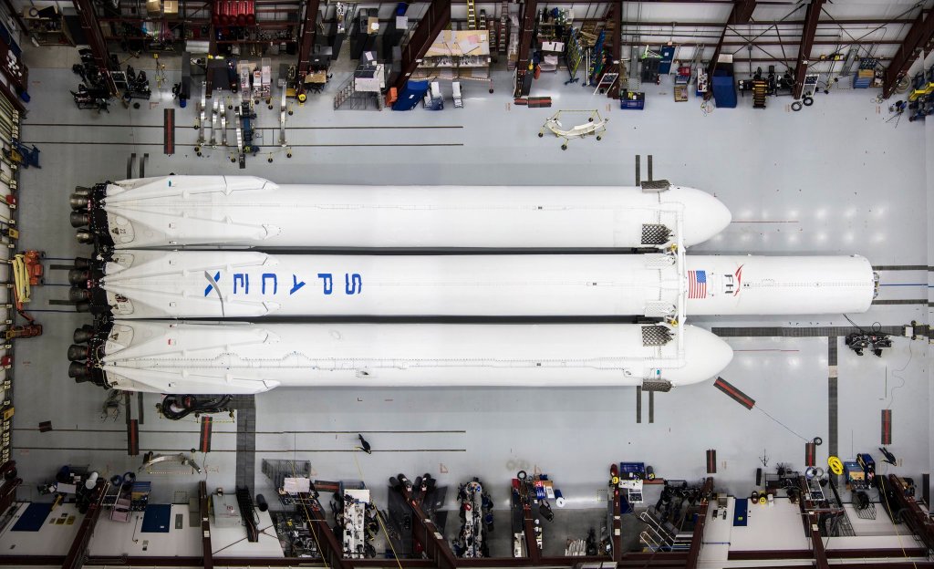 SpaceX CEO Elon Musk shared images of the Falcon Heavy set up in a Cape Canaveral facility, nearly complete minus some remaining elements like the fairing and payload that will top the rocket. You can however see the three boosters, each of which contains nine Merlin engines. Each of these three essentially represents a current Falcon 9, and the two that flank the central column are re-used Falcon 9s that SpaceX has flown for previous missions.