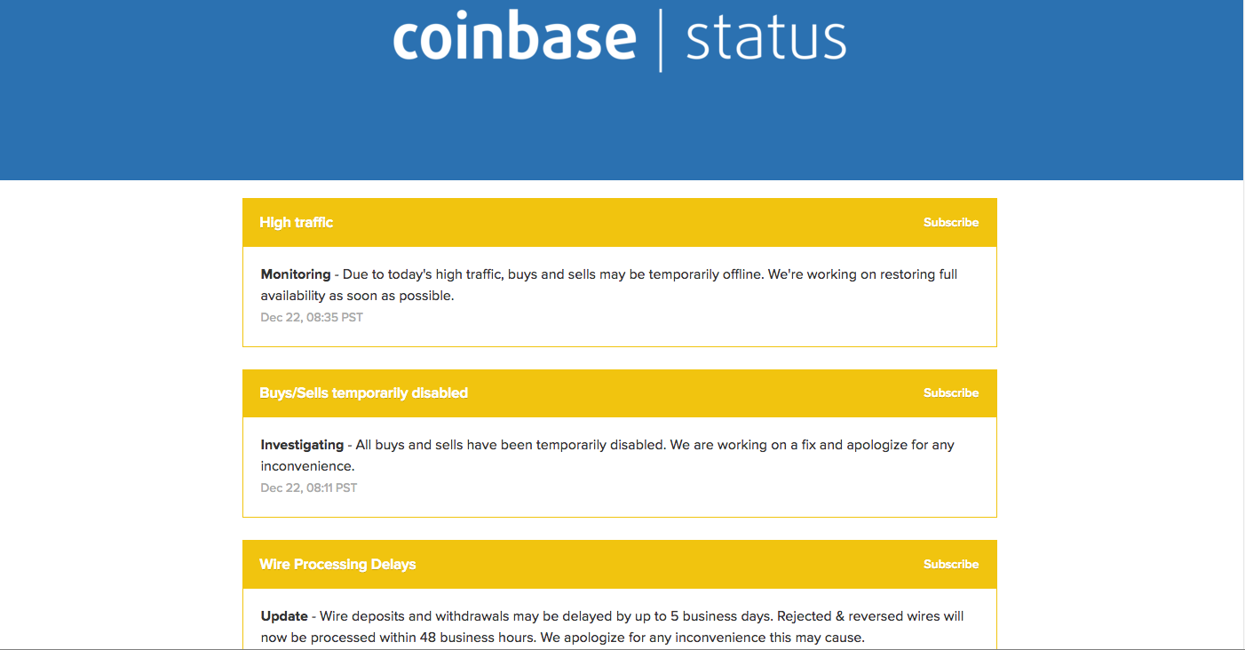 It’s been a tumultuous few weeks for the marquee crypto-currency wallet and transaction company as a late-year surge in transactions have repeatedly felled Coinbase’s services.