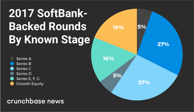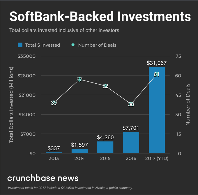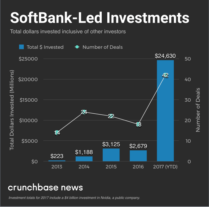 Over the course of 2017, SoftBank invested in 44 funding rounds worth a total of $30.7 billion, according to Crunchbase data. The majority of that capital came from SoftBank-led rounds, in which it’s usually safe to assume the firm and its Vision Fund provided all or most of the money.