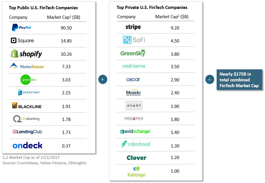 Earlier this year the “fintechs” hit a massive milestone, one that very few people noticed but which must certainly be keeping senior execs at banks, credit card companies and other institutions up at night. In June of 2017, for the first time in history, the top 10 publicly traded U.S. fintechs surpassed $100 billion in total market capitalization.