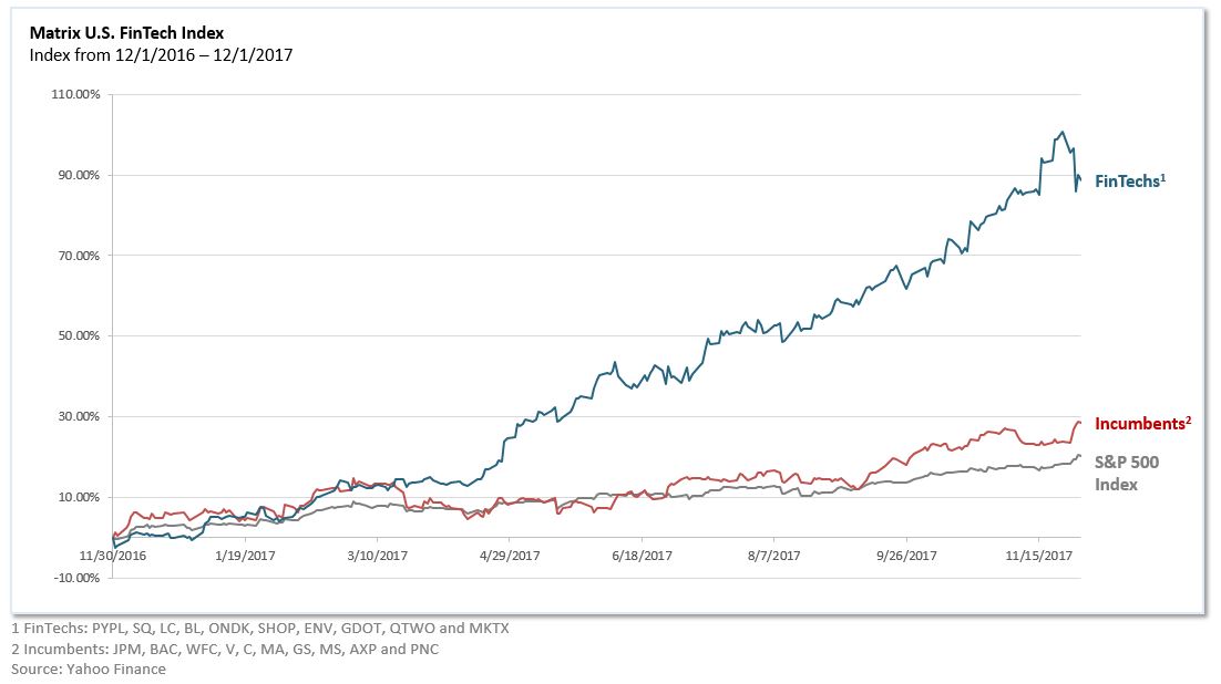 As seen below, the Matrix FinTech Index shows a clear win for the fintechs. To their credit, after a rough year in 2016, the incumbents rallied in 2017 to perform slightly better than the S&P 500 Index — yielding 29 percent returns over the one-year period (compared to the 20 percent returns by the S&P 500 Index).