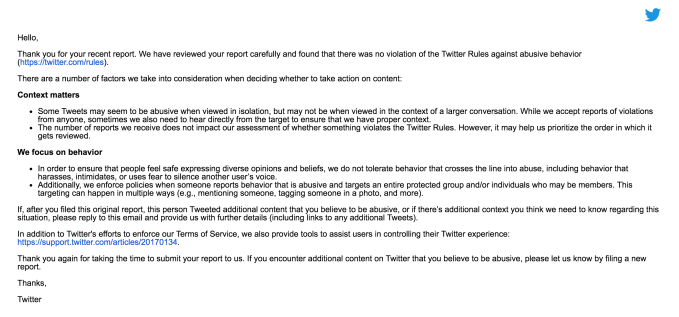 Users were informed the company reviewed the case and “found that there was no violation of the Twitter Rules against abusive behavior.”