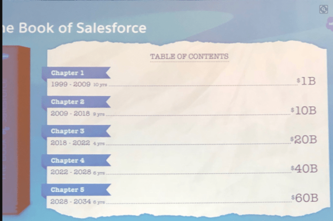 In a slide posted on Twitter today from CTO and co-founder Parker Harris’s presentation to a group of analysts, the company revealed that it has even bigger goals, much bigger. We all had heard about the $20 billion goal by 2022, but how about $40 billion by 2028 and $60 billion by 2034?