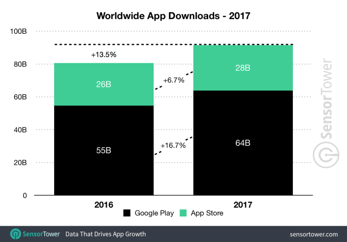 Related to emerging markets’ impact on the app stores, first-time app installs across both the App Store and Google Play were also up. The report found that global first-time app installs grew to 91.5 billion in 2017, up around 13.5 percent from the estimated 80.7 billion in 2016.