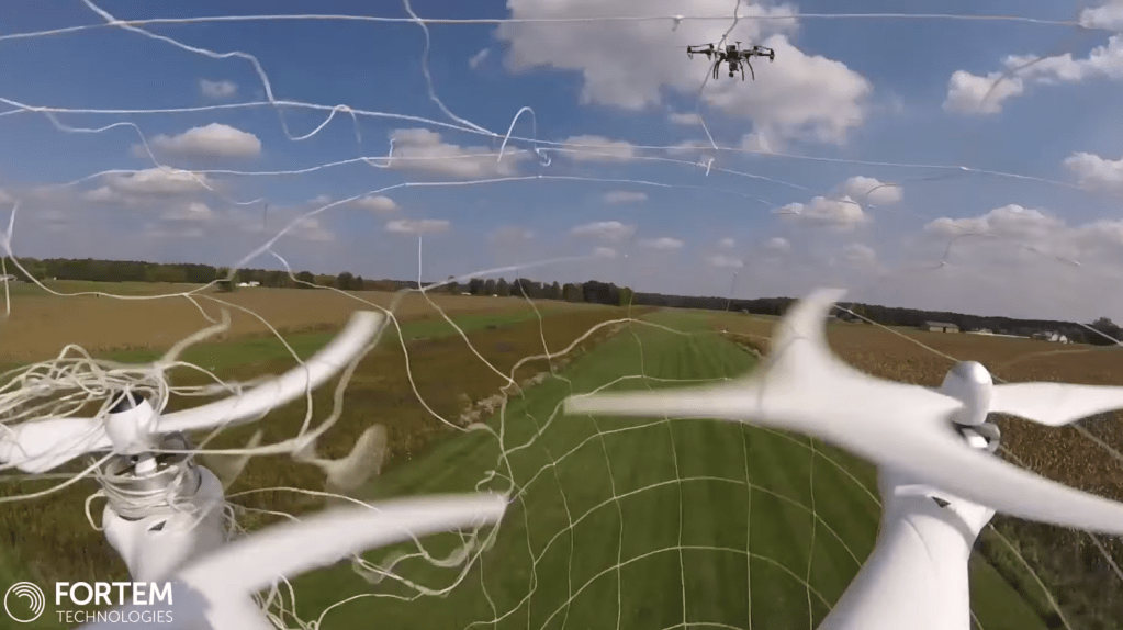 The system uses radar to monitor a designated area and identify potential bad actors. Once a target is identified, a large six rotor drone is deployed that can be equipped with several different takedown devices. This drone then intercepts the rogue drone and shoots a net at the target drone to either cause the drone to crash or tether it to the larger drone. Fortem says this system works with drones traveling up to 100 miles per hour.