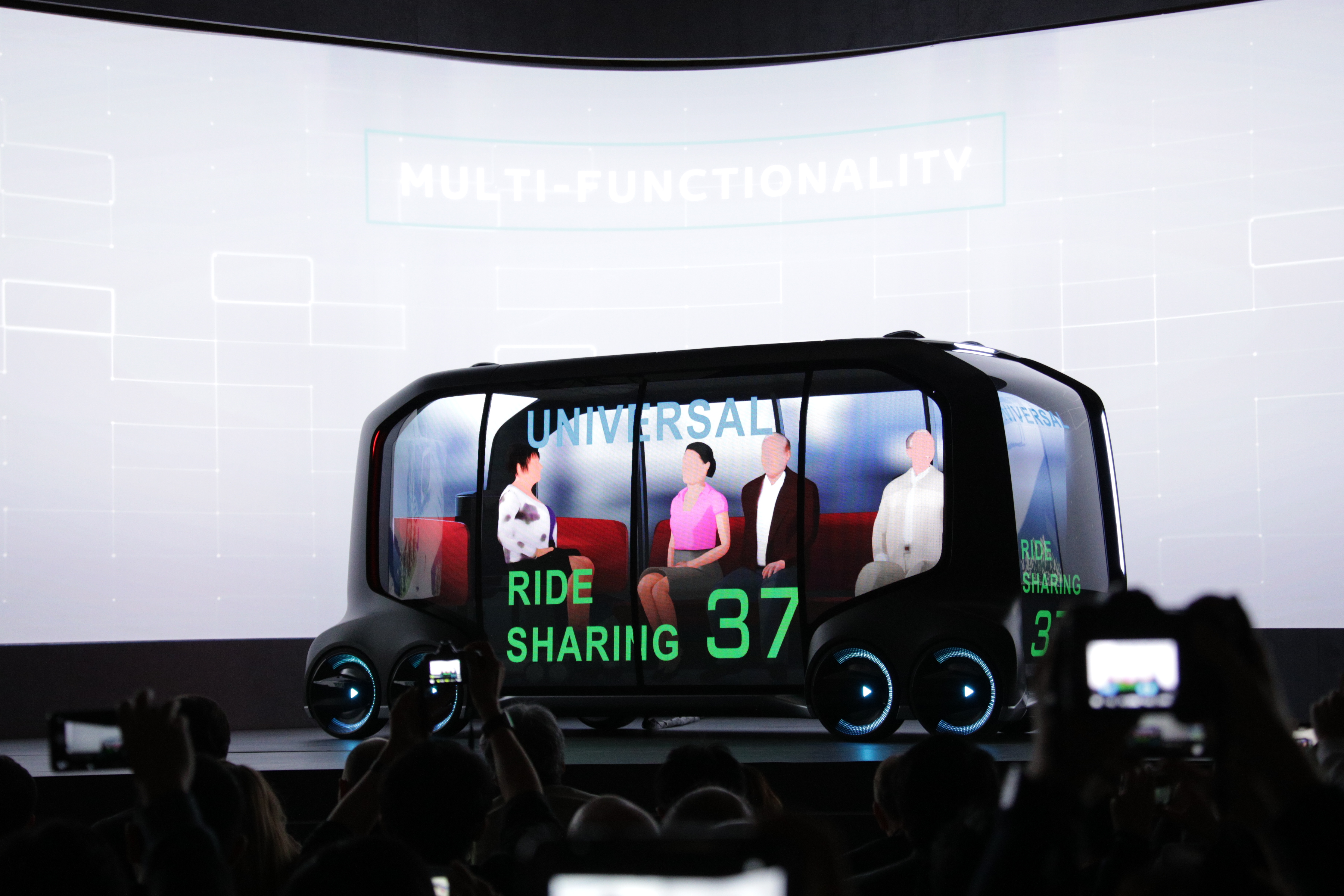 The vision Toyoda laid out was a compelling once, center around its new e-Palette vehicle, which is basically a flexible blank slate on wheels with an electric motor and a fully modular interior design. The big reveal included simulated animation of the car operating in a variety of different capacities, including training multiple together in convoys of urban light-duty transport trucks, picking up as four passengers for shared transit, or just one for a mobile office, acting as a hotel and even delivering food, pizza and packages without anyone on board.