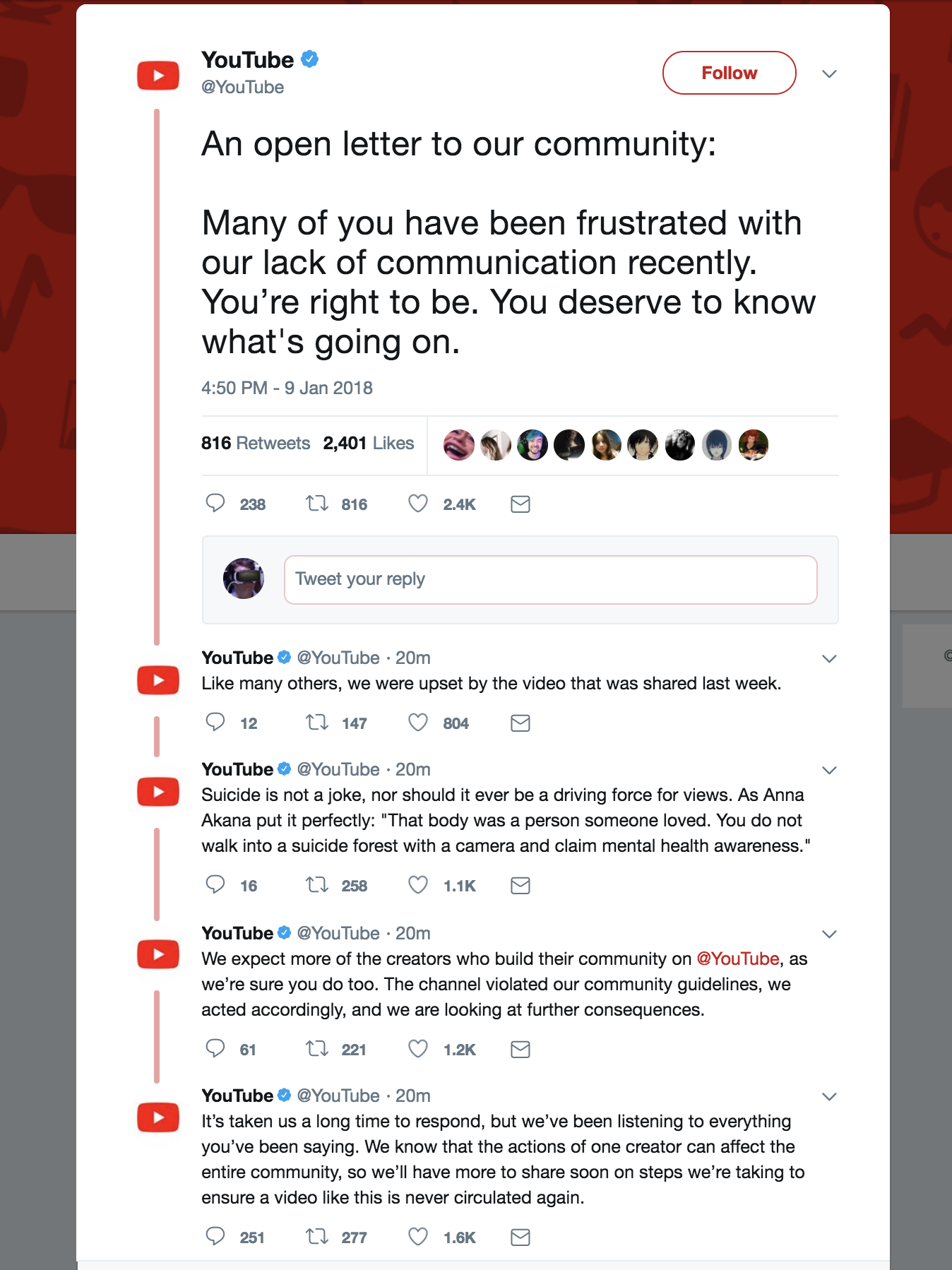 The statement spans five tweets and ends by saying the site will reveal steps it’s taking to prevent this from happening again. But as of publication, Logan Paul’s channel is still on YouTube, so whatever.