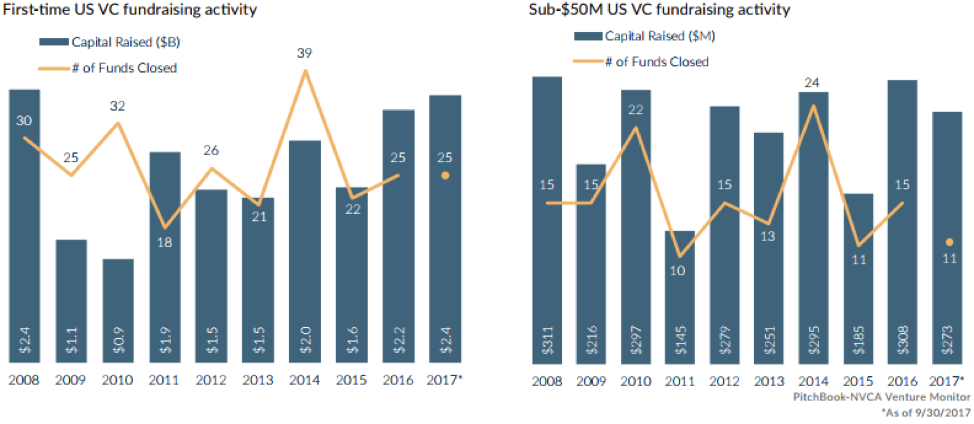 And based on a PitchBook-NVCA Venture Monitor report, first-time funds and micro funds are seeing a lot of success: as of 3Q 2017, $2.4 billion had been raised across 25 first-time funds.