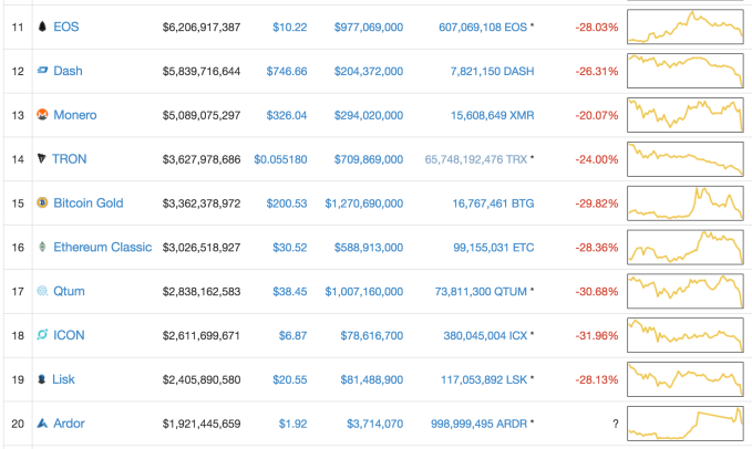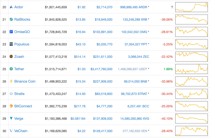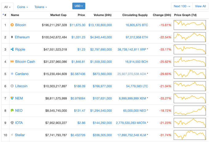 The price drop is having a huge impact. According to Coinmarketcap.com, a site that is quickly becoming the go-to price checker, just one of the top 100 highest valued cryptocurrencies isn’t in the red over the past 24 hours. That’s Tether.