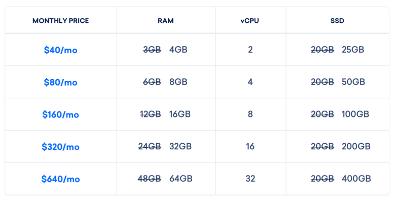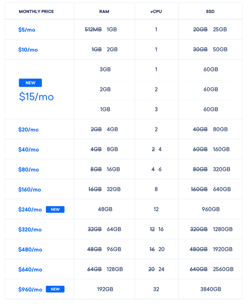 Starting at $40, you get more CPU virtual cores for the same price except on the $160/month model. There are two new expensive droplets, including a new top-of-the-line one. For $960 per month, you get 192GB of RAM, 32 cores and 3840GB of storage.