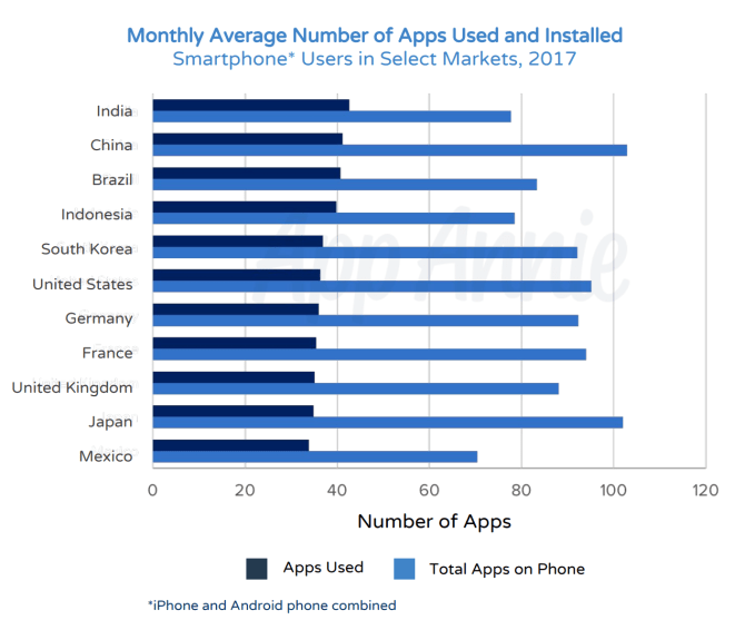 Related to this, App Annie claims that users aren’t just downloading apps – they’re engaging at record levels, too. In most markets, the average smartphone user has more than 80 apps on their phone, and uses close to 40 of them per month (or between one-third and one-half of the apps on their phone per month, on average).
