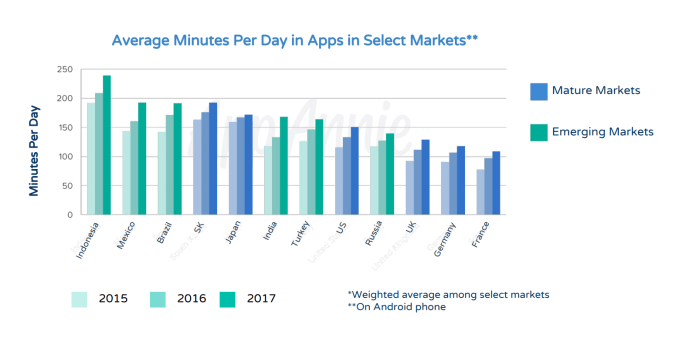 In addition, consumers are spending nearly 3 hours in apps per day on average, and the markets analyzed (see below) have averaged nearly 30 percent growth in average daily time spent since 2015.