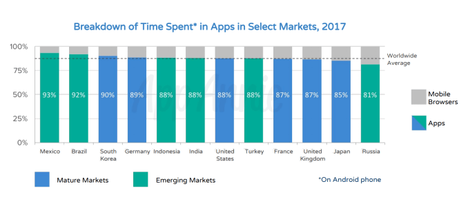 In a number of markets, including the U.S., Brazil, Russia, and others (see below), smartphone users spent 7x more time in mobile apps than on the mobile web, and access them 13x more often.