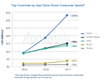 Consumer spend in app stores – including the iOS App Store, Google Play and third-party Android stores – has more than doubled over the past two years, to top $86 billion by the end of 2017. The top markets by consumer spend have all seen double-digit percentage growth during this time, with China in the lead (+270%), followed by the U.S. (+75%), India (+60%), Brazil (+80%) and Russia (+35%).