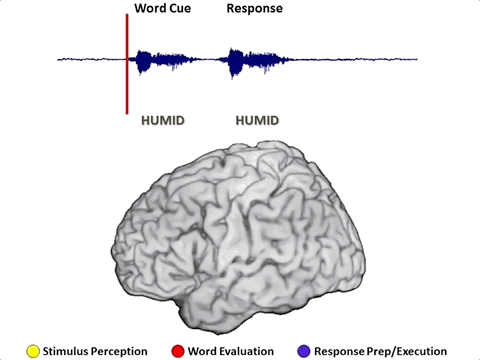 In the video (and gif) above, the patient was asked to repeat the word “humid.” You can see that first active is a part of the brain responsible for perceiving the word (the yellow dots, in one of the language centers); then, almost immediately afterwards a bit of cortex lights up (in blue) corresponding to planning the response, before that response is even fully ready; meanwhile, the prefrontal cortex does a bit of processing on the word (in red) in order to inform that response. It’s all slowed down a bit; the whole thing takes place in less than a second.
