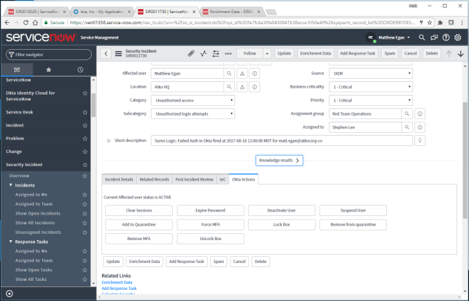 The way it works is a company detects a breach through the ServiceNow security tool. Instead of searching logs and taking days or weeks to find the source of the breach, security operations can see the problem user directly in the ServiceNow interface.