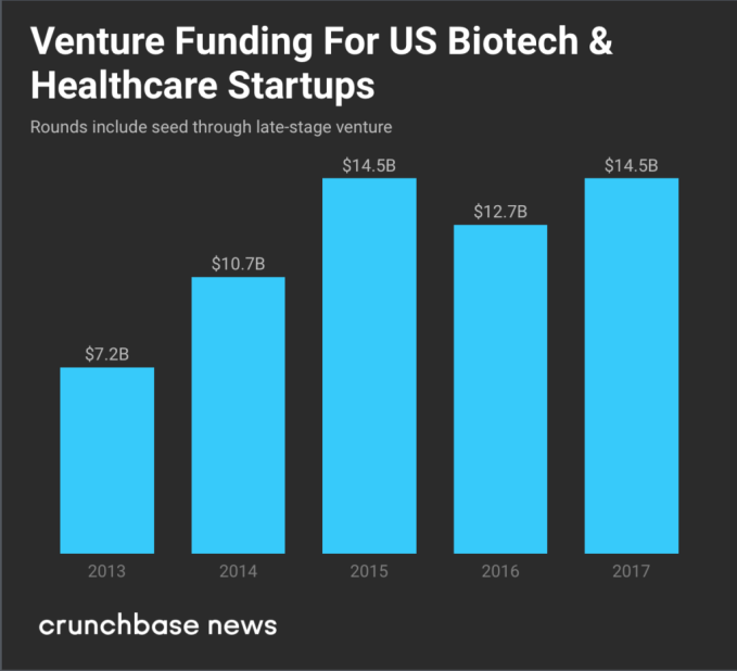 Startup investment is up, too. Overall, investors put $21 billion to work in biotech and healthcare deals at seed through late-stage globally in 2017, according to Crunchbase data. Of that, $14.5 billion was in U.S.-based startups, tied with 2015 as the highest total in five years.