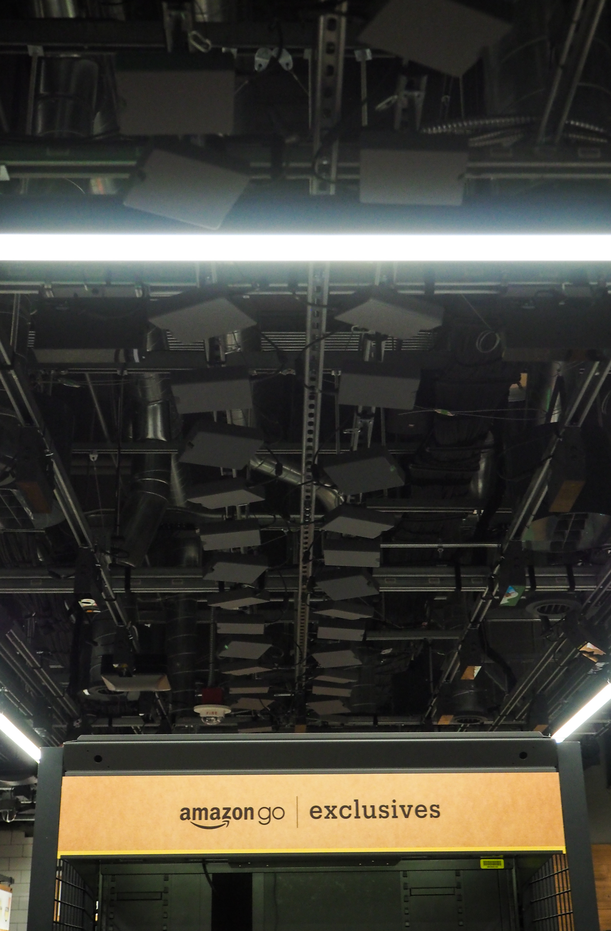 Amazon’s approach wasn’t as complex as I expected, or rather not in the way I expected. Mainly the system is made up of dozens and dozens of camera units mounted to the ceiling, covering and recovering every square inch of the store from multiple angles. I’d guess there are maybe a hundred or so in the store I visited, which was about the size of an ordinary bodega or gas station mart.