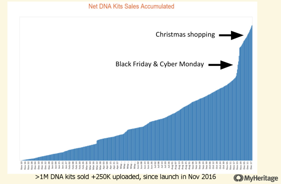During the holiday season alone, MyHeritage sold 400,000 DNA kits, up from the just 36,000 it sold in November and December 2016.