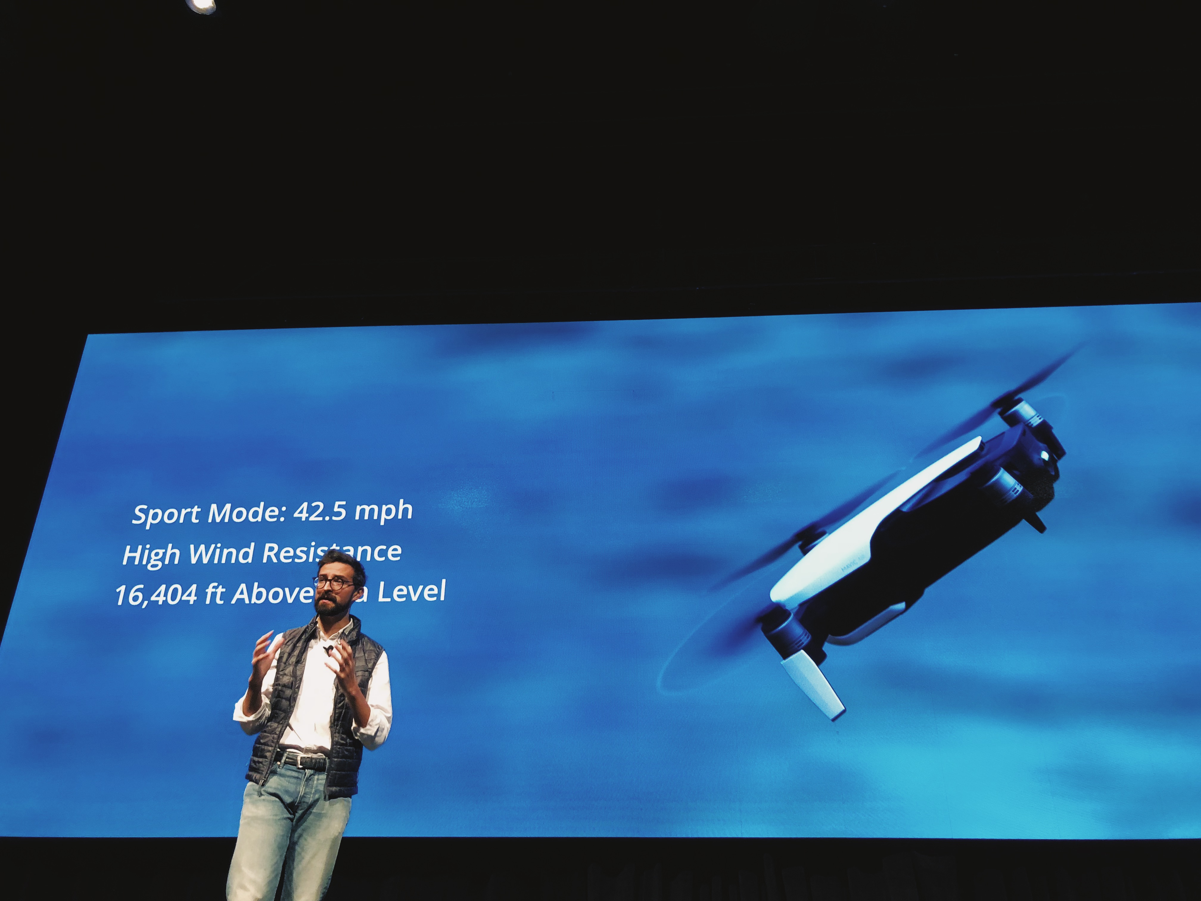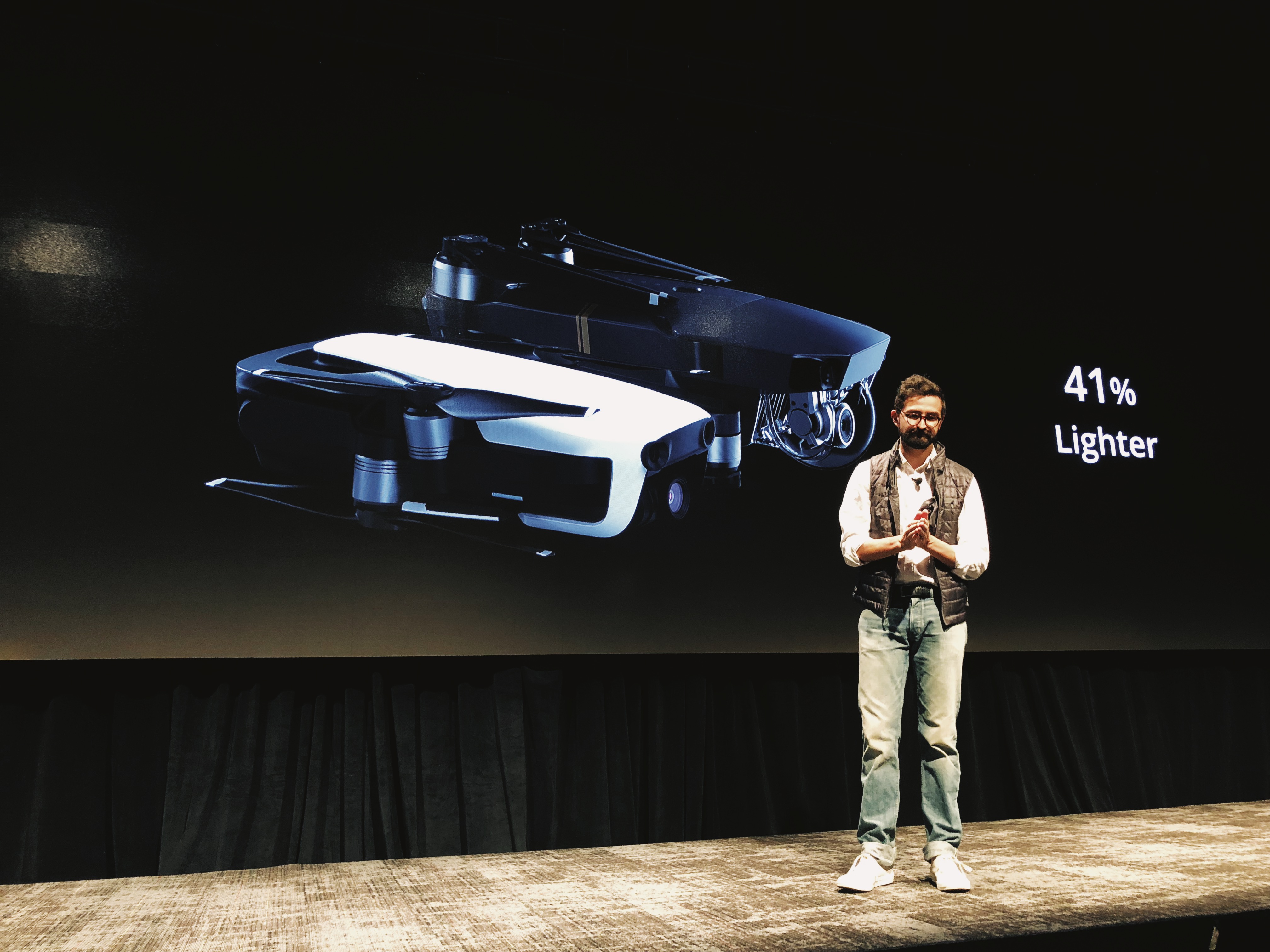 DJI says it “went back to the drawing board” for the Air, which folds up small enough to fit in a pocket. In fact, it’s so portable that the company’s director of North America actually stuffed two of the “smartphone-size” drones into his vest pocket at today’s event.” It’s roughly half the size of the Pro and weighs around 41-percent of its predecessor.
